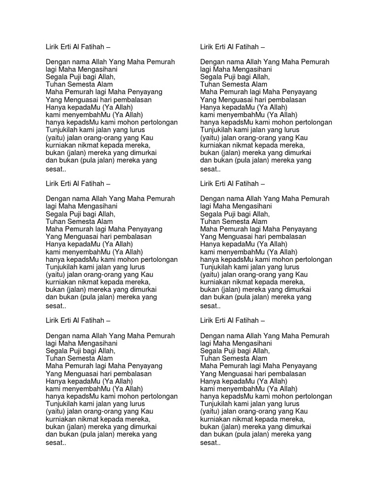 Semoga selepas ini kita lebih mudah untuk mengetahu maksud Surah Al-Fatihah yang mana kita sering membacaanya terutamanya di dalam solat. Isi kandungan surah al-fatihah meliputi. The Lyrics for Erti Al-Fatihah feat.